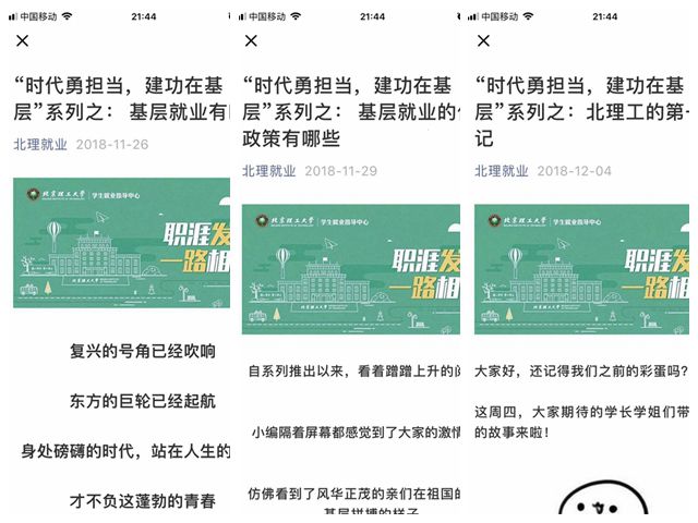 除了校党委书记亲自出席毕业生基层就业座谈会外,校党委副书记包丽颖也将参加选调生、投身基层建功立业作为面向全体新生入学第一课的内容,主动开展对学生的教育引导。为了加强选调生的宣传工作,学校还在就业信息网主页开辟就业专题,及时发布各地方选调生政策。同时,充分利用就业工作微信群、“北理就业”微信公众号等新媒体手段,向学生群体第一时间发布选调生招录信息,并做好宣传引导工作。2018年11月,学校策划推出了“时代勇担当,建功在基层”系列微信推送,为学生提供全方位、多角度的资讯,帮助学生进一步加深对基层和选调生的了解。