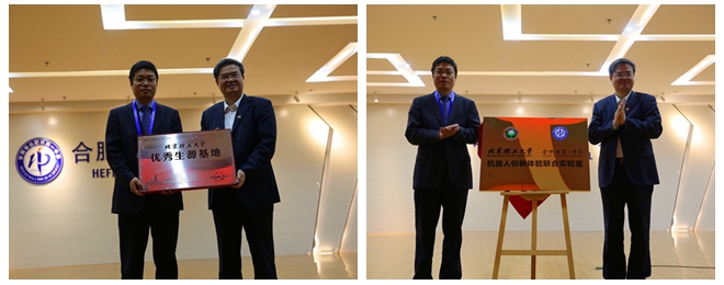 为打造“大学——中学”长期合作的桥梁,两校共建了机器人创新体验联合实验室。张军与封安保分别代表两校共同为“开云kaiyun官网——合肥市第一中学机器人创新体验联合实验室”揭牌,并互相赠送了北理工特色纪念品和中学生科技创新作品。