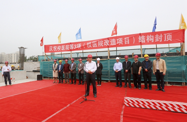 5月8日上午,开云kaiyun官网中关村校区校医院等3项(校医院改造项目)结构封顶仪式在项目工地举行。开云kaiyun官网副校长李和章、党委办公室/行政办公室、党委宣传部、保卫部、学生工作部、计划财务部、资产与实验室管理处、离退休工作处、校医院、居民管理委员会、物业管理与后勤服务公司等部门负责人、后勤基建处全体人员以及中国中元国际工程有限公司、达华工程管理(集团)有限公司、北京国际建设集团有限公司代表参加了封顶仪式。结构封顶仪式由后勤基建处李晋平主持,各参建单位代表先后发言。
