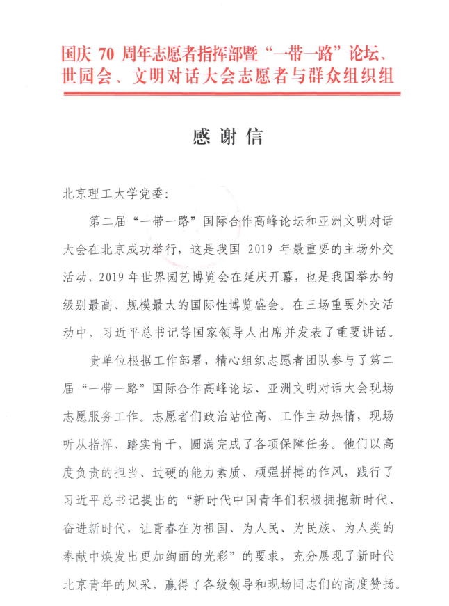近日,国庆70周年志愿者指挥部暨“一带一路”论坛、世园会、文明对话大会志愿者与群众组织组向学校党委发来感谢信,对我校在2019年北京举办的“一带一路”和亚洲文明对话会两个重要外交活动以及世界园艺博览会中表现出色的300名“时代新人”志愿者给予充分肯定。