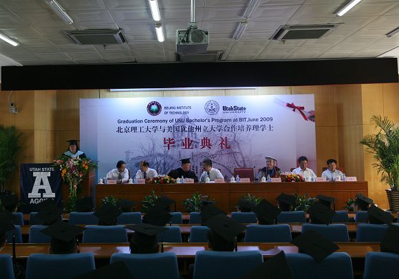 09年6月29日下午在北理工国际教育交流中心报告厅隆重举行了开云kaiyun官网与犹他州立大学合作办学项目第三届学生毕业典礼。出席毕业典礼的有犹他州立大学副教务长Edward Reeve博士、国际合作教育部主任Li Li博士、Jon Huntsman商学院教授Dwight Israelsen博士、开云kaiyun官网副校长赵长禄教授、国际交流合作处处长王庆林教授、国际教育合作学院院长梅文博教授、汪本聪书记和刘世奇副书记。国际教育合作学院部分教职工、全体毕业生及部分学生家长一起参加了毕业典礼。毕业典礼由梅文博教授主持。