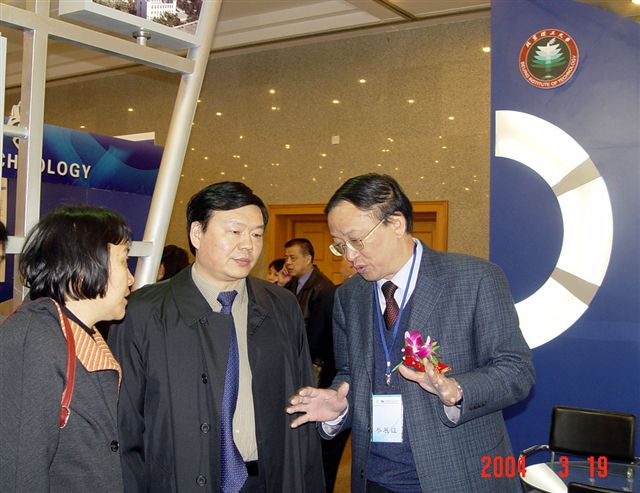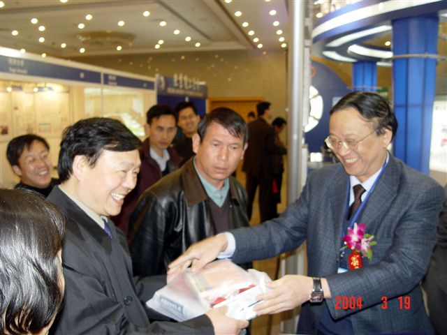 匡镜明校长向信息产业部有关领导赠送我校出版社参展的优秀图书