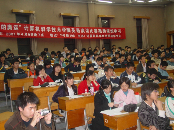 4月9日晚7点,计算机科学技术学院首届“我心中的奥运”英语演讲比赛在7号楼108举行,17名选手先后登场,用英语表达了对2008北京奥运的期盼和祝福。他们对于奥运的热情令人感动,流利的英语口语和良好的文明礼仪获得了评委一致好评。