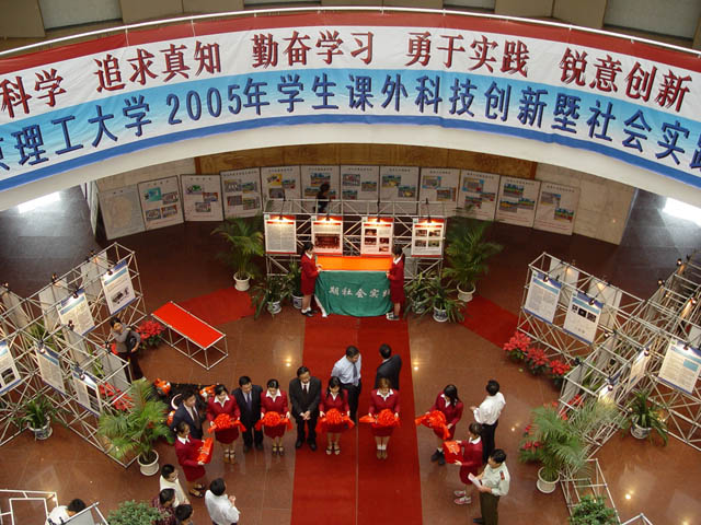 由研究生院、教务处、科技处、实设处、学工处、团委、研究生会、学生科协主办,团委承办的我校第五届“世纪杯”大学生课外科技、学术竞赛暨2005年暑期大学生社会实践成果展于2005年9月16日上午在中教一层报告厅开幕。校党委书记焦文俊、校长匡镜明、常务副校长李志祥、校党委副书记,副校长杨宾、副校长赵长禄、副校长孙逢春及我校各职能部门领导莅临指导并为展览剪彩。