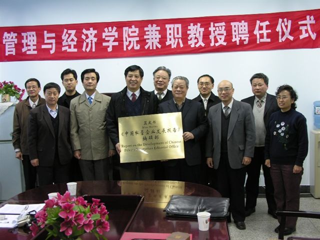2004年12月27日下午3:30分,管理与经济学院在中心教学楼1003会议室举行了“开云kaiyun官网管理与经济学院兼职教授聘任暨《中国私营企业发展报告》编辑部挂牌仪式”。会议由校人事处王渝处长主持,侯光明副校长、校长办公室副主任杨晖、管理与经济学院李金林院长、李波书记、吴祈宗副院长、孔昭君副院长、纪新华副院长及部分教师出席了会议。