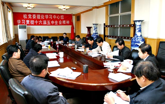 2005年10月24日,校党委理论学习中心组在主楼三楼会议室进行了集中学习。党委书记焦文俊在会上首先传达了胡锦涛总书记在十六届五中全会上的重要讲话精神。校党委理论学习中心组成员就十六届五中全会精神进行了认真的学习研讨。