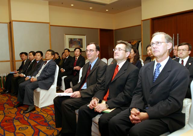 出席签字仪式的有我校焦文俊书记、杨宾副书记、副校长、杨树兴副校长、萨斯卡彻温省省长Lorne Calvert 先生、萨斯卡彻温省工业资源部部长 Eric Cline 先生、萨斯卡彻温大学副校长 Steven E. Franklin 博士及加拿大驻华使馆公使等。出席签字仪式的还有我校生命科学院张玉奎院士、研究生院副院长梅文博、人事处处长于倩、招生分配处处长郝志强、生命科学学院院长邓玉林、副院长罗爱琴等。加拿大萨斯卡彻温省省长Lorne Calvert 先生代表政府对两校合作协议的成功签署表示祝贺。他说,今天是一个十分重要的日子,因为有两所著名的大学即将在这里签订协议。我们的政府对这个协议以及由协议而产生的一切行动都将给予最大的支持。政府部门将努力为两所学校今后的合作提供良好的环境,积极推动合作的深入开展。焦文俊书记在讲话中表示,中加两国的友好源远流长。自1970年建交以来,双方的友谊与日俱增。今年是中加建交35周年,两所大学在这个时刻签订校际合作协议,意义重大。随后,杨树兴副校长和萨斯卡彻温大学副校长 Steven E. Franklin先生分别致词。