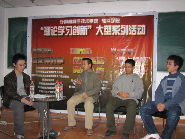 2005年11月24日计算机科学技术学院、软件学院共产主义学习实践会在理工科技大厦2108室举行了“理论学习创新”大型系列活动之访谈节目----“红色足迹 党员人生”。本次活动的主旨在于丰富理论学习模式,转换理论学习的角度,促进学员对理论学习的积极性、主动性。