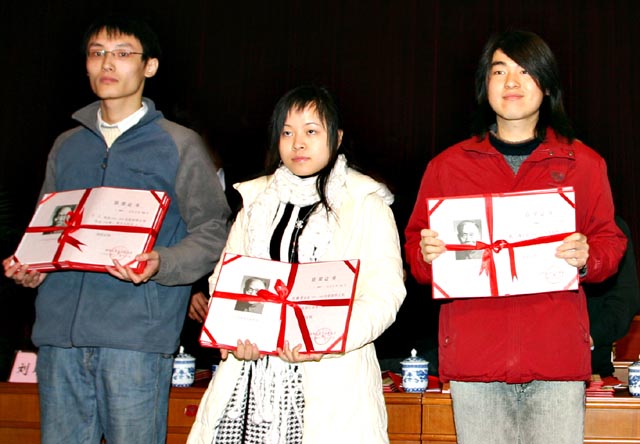 副校长孙逢春宣布“徐特立奖学金、社会捐助奖学金获奖名单”和“2005年度学科知识竞赛获奖学生名单”,党委副书记、副校长杨宾宣布“关于表彰2004-2005学年优秀学生标兵、优秀学生、优秀学生干部、先进集体、优良学风班的决定”,并向获奖的学生表示祝贺。本次评选标准较高,参选者间竞争激烈。在社会捐助奖学金的评审过程中,候选人都显现了扎实的学科基础和较强的科研能力,体现了学生综合素质的提高,最终共评出“徐特立奖学金”32人、中国科学院等其他社会捐助奖学金235人、国家奖学金325人。