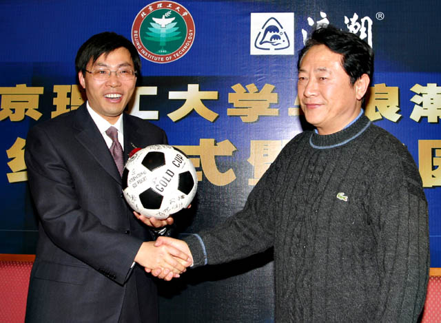 我校足球队总教练金志扬教授向浪潮集团赠送有我校足球队员签名的足球,感谢浪潮集团对我校体育事业的大力支持。