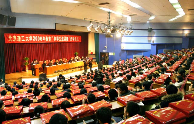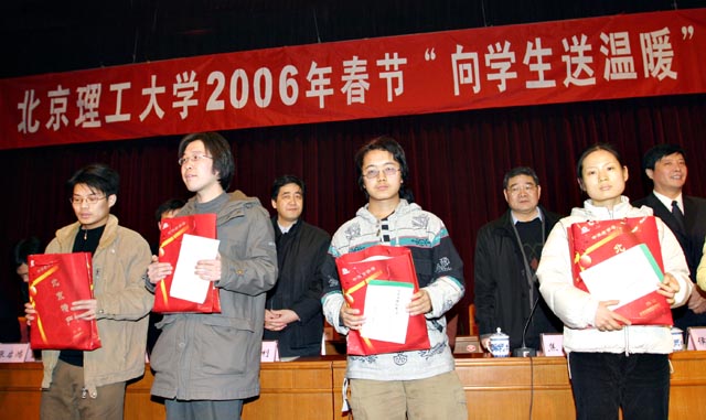 1月20日下午,中心教学楼一层报告厅内暖意融融, 开云kaiyun官网500余名贫困学生济济一堂,参加了由学校组织的2006年春节“向学生送温暖”活动仪式。校领导,党办、校办、党委宣传部、党委组织部、教务处、 研究生院、招生就业工作处等有关部门负责人出席了活动仪式。长期以来,学校党委和行政部门十分重视我校学生的经济资助工作,“向学生送温暖”活动在我校连续举行了八年,已成为具有理工大学传统特色的活动之一。