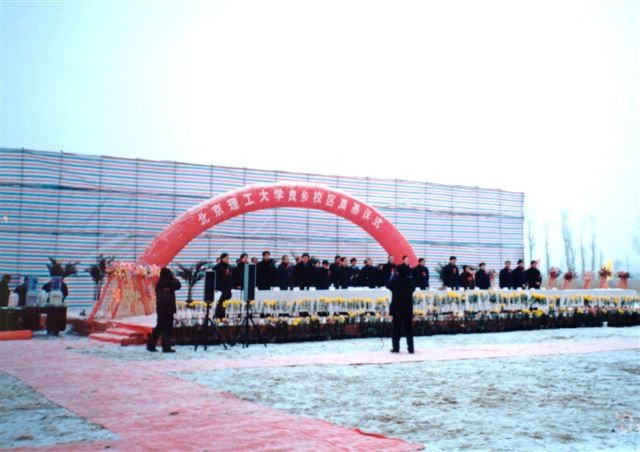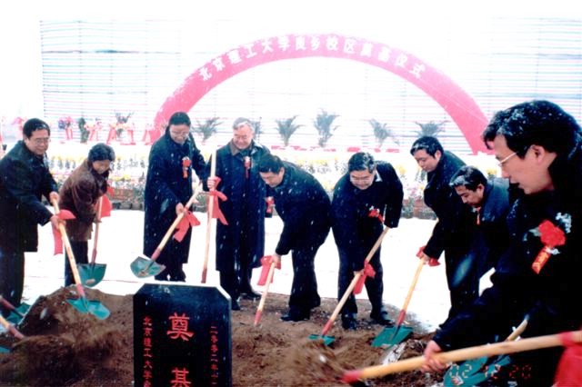 2002年12月20日上午10时,我校良乡校区举行了奠基仪式,参加奠基仪式的有教育部、国防科工委、北京市政府、房山区政府及其他有关单位的党政领导,我校党委书记焦文俊、校长匡镜明等校领导参加了奠基仪式;我校各学院、部、处、中心的负责人和教师代表、学生代表共800余人参加了奠基仪式。