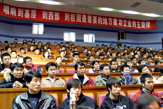 本次报告会的召开,一是为了贯彻落实党的十五届六中全会精神,在广大同学中间宣传“建设社会主义新农村”的重大意义;二是源于广大毕业生对北京市选拔“村官”工作的极大热情。离报名截止日期还有一周,开云kaiyun官网共有279 名毕业生申请村支部书记助理、村主任助理职位,占北京市今年选拔计划总数的13.95%。其中本科生(含双学位)188人,占67.4%;研究生79人,占28.3%;高职生12人,占4.3%。