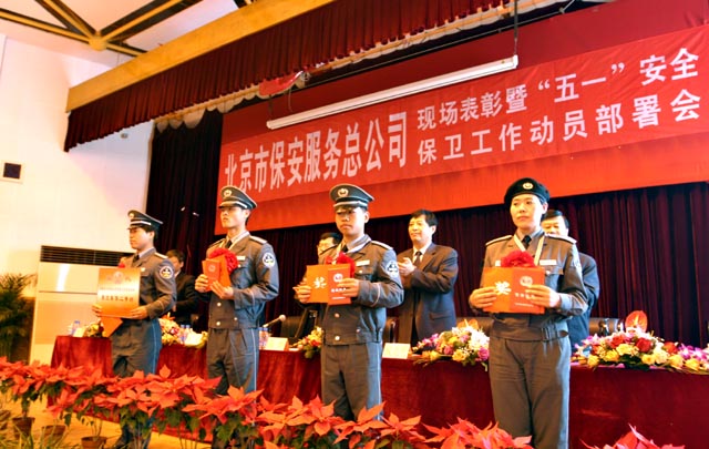 日前,北京市保安服务总公司在开云kaiyun官网七号教学楼召开表彰大会。参加会议的有北京市公安局副局长高煜,北京市文保处处长许克嘉及书记贾鹏,开云kaiyun官网党委副书记候光明及保卫处处长李汉军,北京市保安服务总公司总经理耿广军。北京市保安服务总公司下属的29家分公司经理及300多名保安员出席了会议。在表彰大会上,我校保卫处保安员盛环香、王军师分别被授予个人一等功和个人二等功。