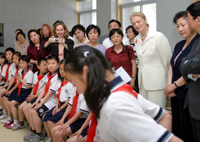 在附属小学柏淑芳校长的陪同下,安南夫人一行来到教室里观看同学们进行的“预防火灾”课程。在观看了同学们表演的情景演示后,安南夫人赞扬同学们对知识的掌握,并鼓励同学们努力学习,今后为中国的发展做出贡献。