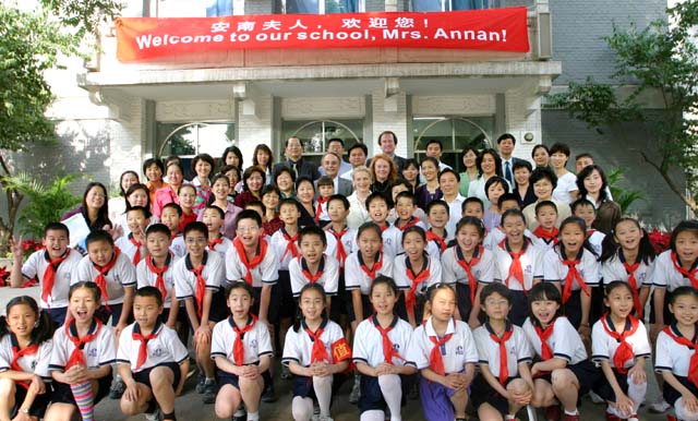 最后,安南夫人一行与附小的学生、老师,北京市、海淀区妇联领导以及我校陪同访问的部门领导等合照留念。