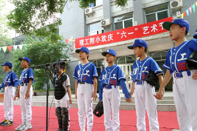 接下来便是孩子们自编、自创、自导、自演的精彩节目:瞧!棒球队员们个个都是棒小伙,他们高唱的《真心英雄》充分展示了我校学生积极向上、勇往直前的风采。还有《我爱北京天安门》、《大树妈妈》、《卖报歌》、《让我们荡起双桨》……一首首耳熟能详的童谣从孩子们稚嫩纯真的口中唱出,那股认真劲儿、那份童趣感染了台下所有的观众,快乐的气氛环绕在整个校园。此次艺术节活动还有:现场书画赛、“写好一笔中国字”的书法展、“小小名人我能行”才艺展示等各种丰富多彩的活动。