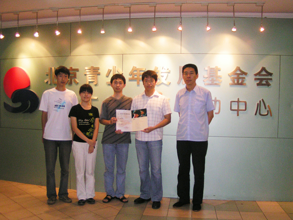 8月5日上午,Collapsar队向北京青少年发展基金会捐款。左三为刘建君、左四为李京峰。