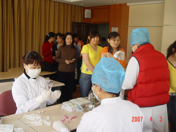 响应北京市 "同样的权利,同样的健康,更多的服务"流动人口免疫预防工作宗旨号召,2007年4月3日下午,在后勤办公楼二层报告厅,我单位与校医院合作,为外地务工人员进行了流脑、麻疹免费疫苗的接种工作。接种对象为3年内未接种过流脑和5年内未接种过麻疹疫苗、40岁以下且于2005年7月1日后来京的各中心务工人员。在人力资源部和校医院保健科统筹协调下,总务后勤部百余名务工人员分时段、有秩序地进行了接种,并领取了《北京市外来务工人员预防接种证明》。此次活动为避免流脑、麻疹等流行性传染病春季大面积暴发,提高务工人员的免疫能力,维护他们的身体健康将起到积极的作用。