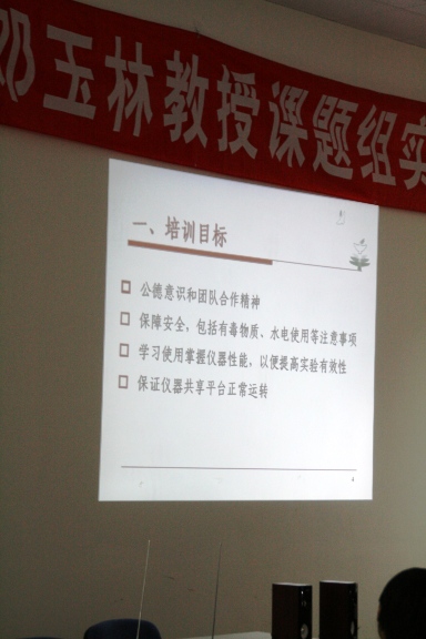 此次培训为第一部分的实验室管理制度、化学品安全以及常用仪器的规范使用的培训,内容包括实验室的准入与工作规范、实验室管理规定、化学品安全、动物实验要求及注意事项、实验室卫生安全值日管理办法、学术道德准则、研究生学术管理条例、研究生量化考核办法、实验用品申购、报销、借款规定及流程、实验室大型仪器预约、使用规定及流程等。大型仪器设备的规范使用与维护,将由仪器负责人分批进行现场的讲解和培训。培训考核通过者方可获得实验室的准入和仪器的使用权。