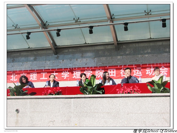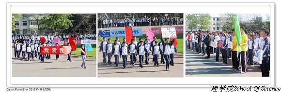 2007年4月14日上午八点,理学院2007年春季运动会在温暖和煦的春风中拉开了帷幕。理学院党委书记何明,党委副书记、副院长姜艳,副院长胡海云,研工委书记张嫄,分团委副书记安泰,分团委副书记卢俊峰以及各班的班主任老师出席了运动会开幕式。