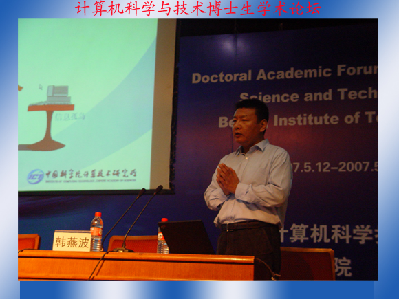 首先是韩燕波教授的报告。韩教授为中科院计算技术研究所研究员、博士生导师、中科院研究生院教授。他报告题目为《面向服务的业务端编程范型》,内容涉及分布系统应用集成、基于互联网的智能信息服务、环境敏感的个性化信息服务、服务组合、信息融合、业务流程管理和协同、最终用户可用的网络应用“编程”方法和语言、服务网格中间件、以及上述技术的行业应用等。