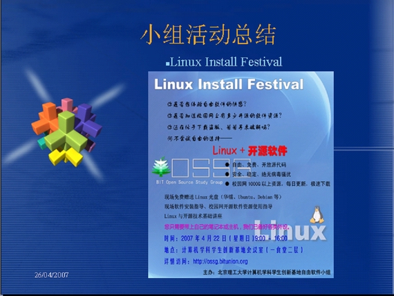 李凌老师做自由软件项目小组的介绍,李老师从目前开源软件的形势进行了简单的介绍,开源软件是当今计算机业界最具有活力的领域,对正在成长的中国计算机业界的意义尤其重大,接着李老师总结了上阶段项目组开展活动的情况,并提出了下阶段的工作规划。