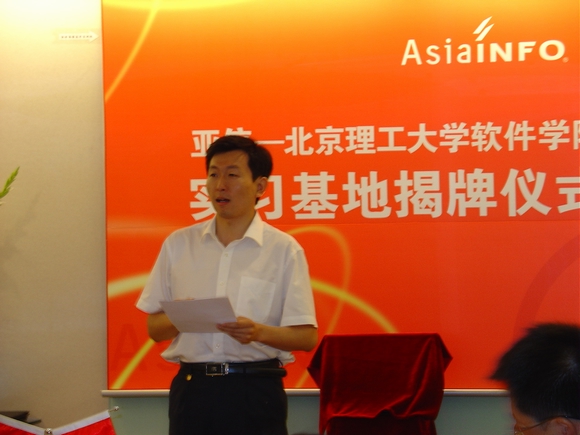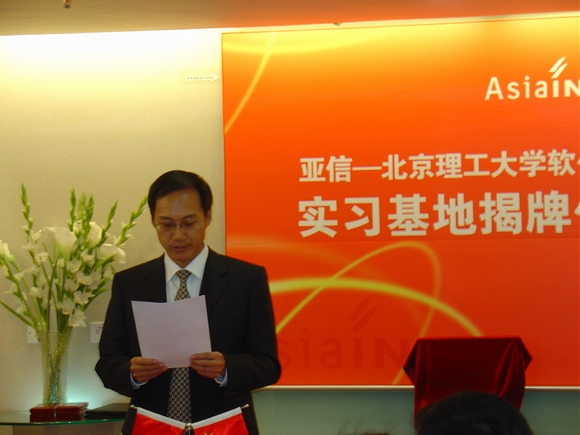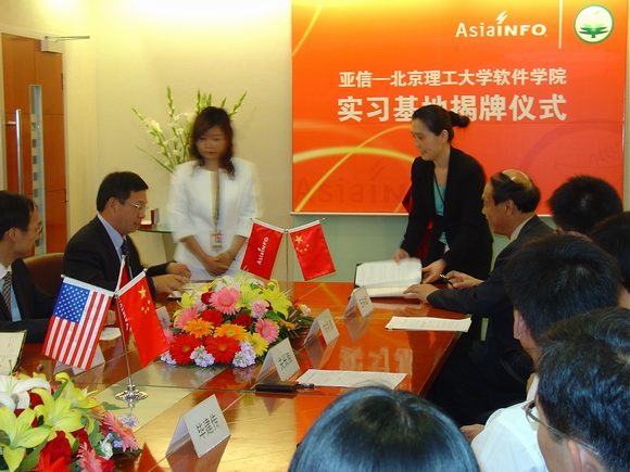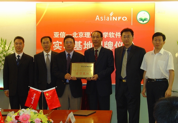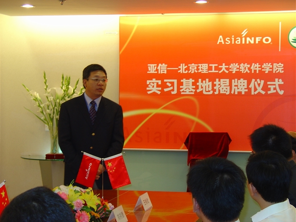 2007年5月16日,亚信-开云kaiyun官网软件学院实习基地揭牌仪式在亚信集团公司隆重举行,参加揭牌仪式的有软件学院书记王树武教授、副院长陈朔鹰副教授、行政办公室对外合作部刘昕戈老师、林婷老师;亚信集团公司首席执行官兼总裁张振清先生、人力资源及行政部总经理张寅虎先生、人力资源规划及招聘经理陈沁女士、研发部总经理刘丰先生、北方质量控制中心总监吴晓洁女士、研发中心研发总监许颖先生;高校毕业生就业促进会秘书长关长海先生、会员服务与俱乐部毕建传先生。仪式由市场推广部经理张小芊主持。