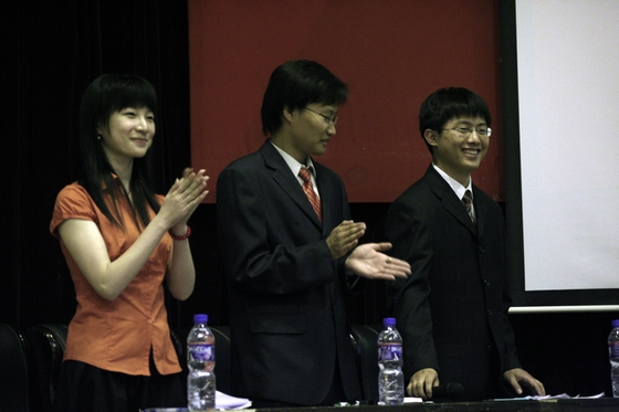 表演赛过后决赛正式开始。正方是来自2006级的国际经济与贸易专业三班代表队,反方是来自2006级信息管理专业二班的代表队。这两支队伍在前期的三轮淘汰赛中脱颖而出,经过三轮比赛的历练,两方的辩手辩论技巧日趋成熟,已经成为了管院辩论场上的新星。