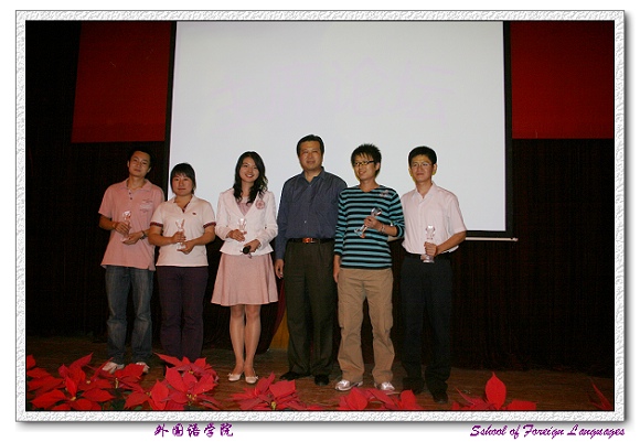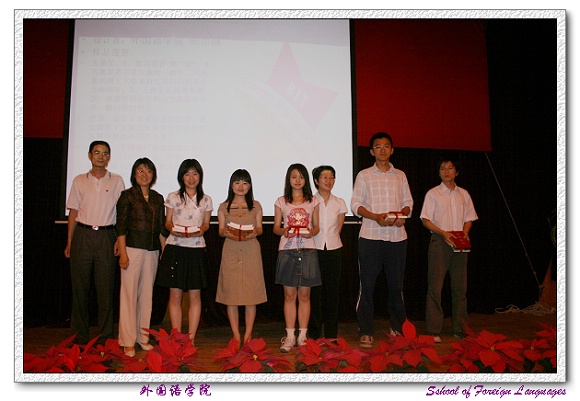 外国语学院副书记、副院长吴文君老师,副院长李京廉老师、林彤老师为获得院徽设计二、三等奖的获奖者颁奖。