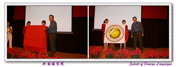 闭幕式另一项主要议程就是外国语学院院徽征集活动的颁奖,并进行了外国语学院院徽的揭幕仪式。外国语学院院长吴树敬老师为学院的院徽揭幕。
