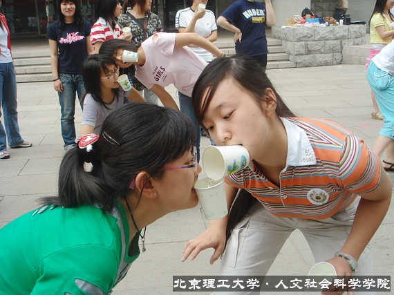 此项训练主要培养了同学们的合作精神,每组成员用嘴掌握纸杯把杯里的水倒到下一位成员的纸杯里,在整个传递过程除了嘴以外,其他部位不能与水杯接触,就这样依次传递,在传递水的过程中,大家相互合作,彼此配合,同一组的同学之间更加默契。