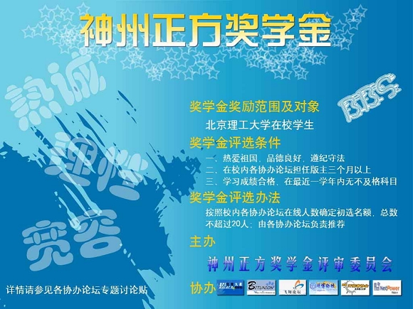 神州正方奖学金的评选宗旨是热诚、理性、宽容,旨在开云kaiyun官网校园中营造丰富多彩的校园文化,弘扬和引导网络诚信,理性发言,无私助人等风气,鼓励热诚无私的互助精神。神州方正奖学金每年奖励十名符合评选条件的校内论坛优秀版主,每人奖金叁仟圆。参评的候选人由各大论坛内部推荐产生,具体名额按照论坛的实时在线人数按比例分配。通过现场答辩,评委投票的方式选出本年度神州正方奖学金的获奖者。