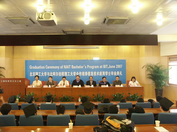 毕业典礼上,22名学生顺利的获得了加拿大北阿尔伯塔理工大学的信息技术应用学士学位。Garry Lin博士、Alan McInnes先生和梅文博院长做了重要的讲话,对学生们今后的成长给予了很高的希望,希望他们志存高远,脚踏实地,用自己的知识为祖国做贡献。