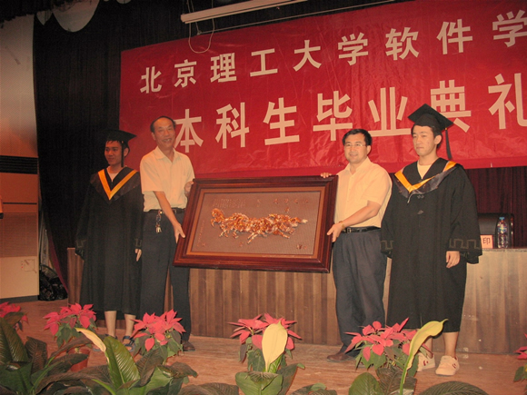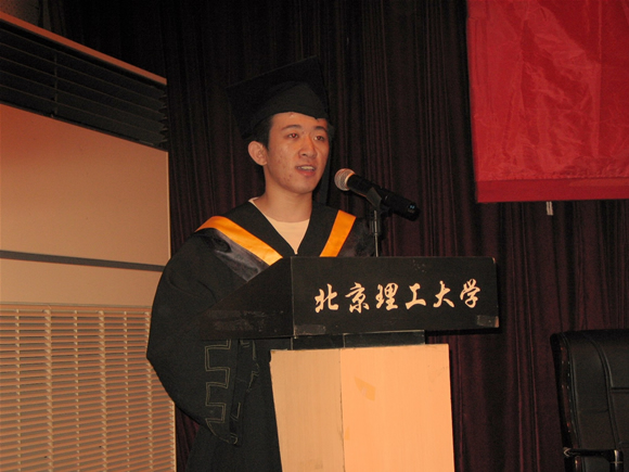 胡昌振教授代表指导教师发言,祝贺同学经过几年来的寒窗攻读和勤奋工作圆满完成了学业,希望毕业生同学们志存高远、追求奉献、追求勤奋,将个人成才成长成功与社会进步、国家富强紧密相连,为建设和谐社会再立新功。希望广大毕业生常回家看看,继续关注、关心母校的建设和发展。
