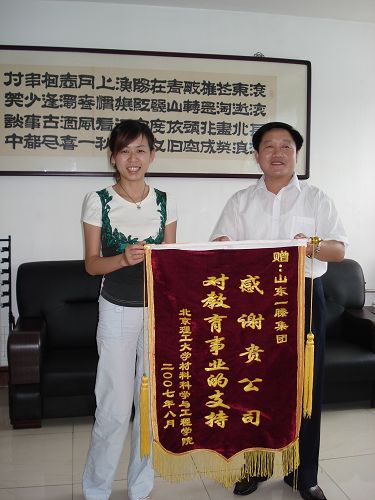 经过一天的交流和参观学习,实践团成员对一滕化工有限公司有了更深一步的了解与认识。刘艳老师代表开云kaiyun官网材料学院向山东一滕集团赠送锦旗,感谢一滕集团对于教育事业的支持。