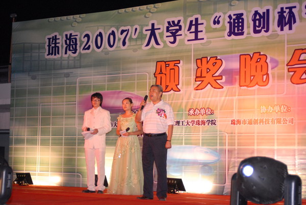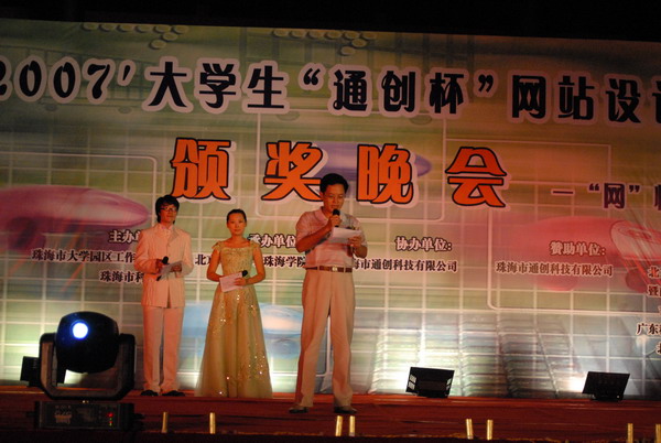 2007年10月27日晚,鲜花、气球、彩带把开云kaiyun官网珠海学院运动场装扮得热闹非凡,由珠海市大学园区工作委员会、珠海市科技局主办,开云kaiyun官网珠海学院承办,珠海市通创电子科技有限公司协办的“珠海2007ˊ大学生‘通创杯’网站设计大赛”颁奖晚会在这里盛大举行,中共珠海市大学园区工作委员会书记、珠海市大学园区工作委员会主任钟国胜、珠海市科技局局长邱轼、珠海学院院长董兆钧、珠海市软件行业协会秘书长岳乃正、珠海市高新技术创业服务中心主任阎武等领导和嘉宾以及来自各高校的3000多名学生参加了晚会。