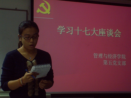 10月25日,管理与经济学院第五党支部在国际交流中心709举行座谈会,学习和传达中国共产党第十七次全国代表大会相关内容及精神。党支部成员参加了学习,院党委的于传人老师和周卫东老师作为特邀嘉宾参加了学习会议。