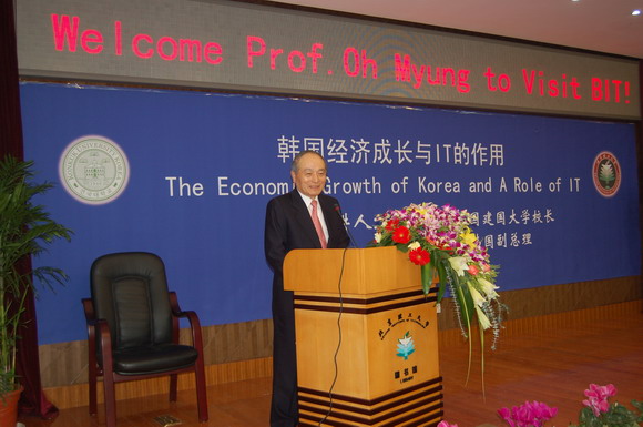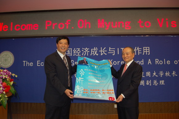 韩国建国大学校长吴明教授应邀来我校作了题为“韩国经济增长与IT的作用”的演讲。吴校长曾担任韩国副总理、韩国科技部部长、韩国邮政部部长、韩国建设交通部部长、韩国大学校长委员会主席、韩国亚洲大学校长等职务。