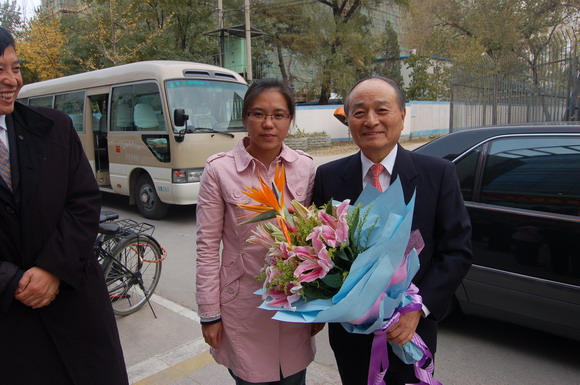 一位朝鲜族女同学代表我校学生向吴校长献上了鲜花,表达了对吴校长诚挚的欢迎。