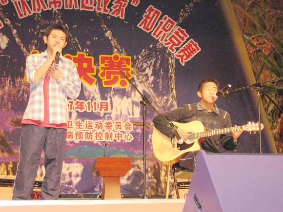 10日上午八点志愿者们到达丰台文化馆,开始志愿活动。丰台分会场活动是由农工北京市委暨丰台区工委,区爱卫会,区政协科教文卫体委员会联合主办的。开幕式前,各个协办单位在馆外设置了展台,进行主题宣传。志愿者们主要是发放资料,对本次国际科学与和平周进行宣传,并参与了联合签名活动。开幕式活动以知识竞赛方式展开,会场内观众还积极参与到互动环节中,现场气氛热烈。协会志愿者梅南捷与李言同学还现场表演了吉他弹唱《外面的世界》。