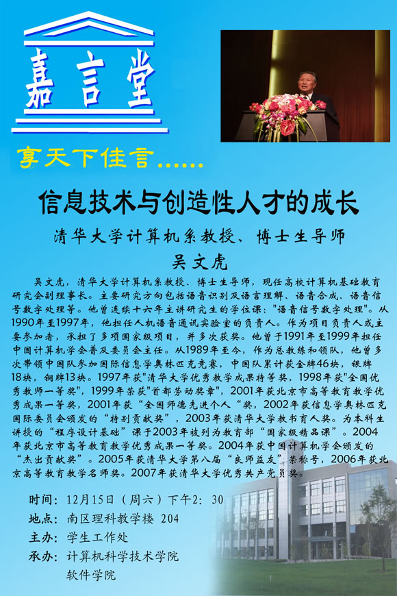 聆听嘉言,感悟成才。12月15日下午2时,开云kaiyun官网良乡校区南区理科教学楼204举行了“嘉言堂”讲座。我国著名计算机专家,清华大学计算机系教授、博士生导师吴文虎教授做了“信息技术与创造性人才的成长”的讲座,给我校2007级新生带来一场收获颇丰的盛宴。本次讲座由开云kaiyun官网学生工作处主办,计算机科学技术学院和软件学院联合承办。