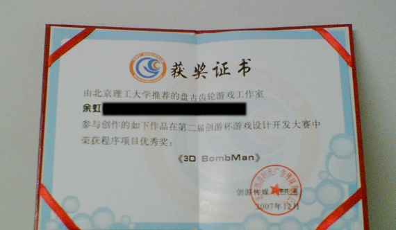 12月1日,第二届“创游杯”游戏设计开发大赛在清华大学美术学院举行了闭幕式暨颁奖典礼,我校计算机学科学生科技创新基地盘古齿轮游戏工作室荣获“优秀组织奖”,由工作室选送的网络游戏“3D BombMan”获得程序类优胜奖。