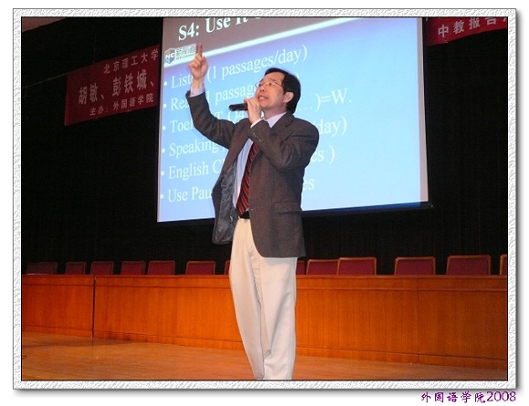 在活动中,北京新航道集团总裁胡敏先生和副总裁彭铁城先生与在座的师生共同分享了自己甘苦交织的创业经历以及发人深省的人生感悟。彭铁城先生在22岁时才开始自学英语,从零基础到微软总部研究院计算语言学家,他顽强拼搏、勇于挑战的精神深深震撼了在场的每一位听众。