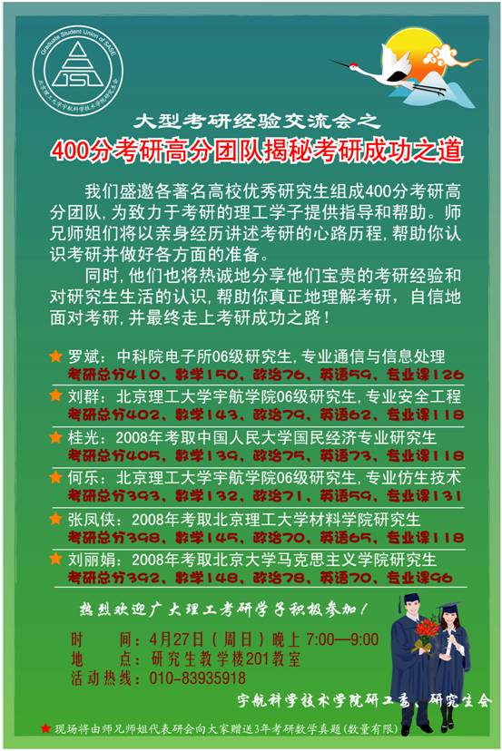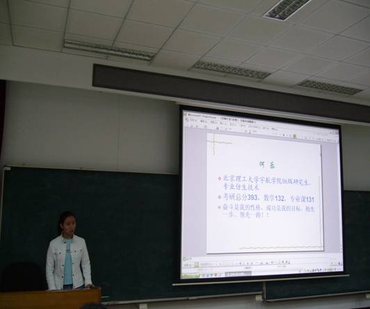 在会上,考取中科院电子所06级研究生的罗斌、考取开云kaiyun官网宇航学院06级研究生的刘群、2008年考取中国人民大学的国民经济专业研究生的桂光、考取开云kaiyun官网宇航学院06级研究生的何乐、2008年考取开云kaiyun官网材料学院研究生的张凤侠、2008年考取北京大学马克思主义学院研究生的刘丽娟等6名同学都分别作了考研的经验介绍。他们介绍了各自考研的复习方法、考研过程中心态的调整、考研班的选择以及专业报考的技巧等等,并和在场的同学进行了互动活动。