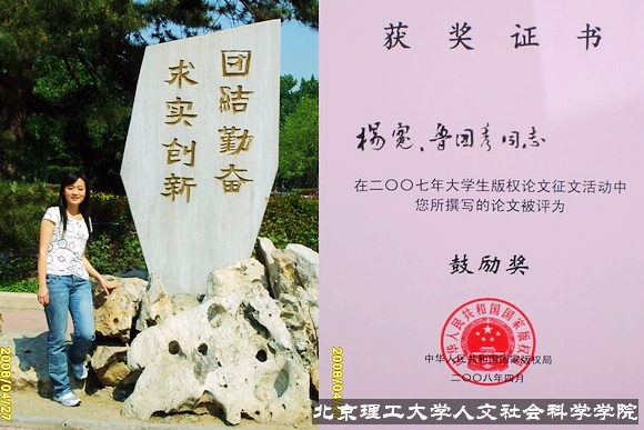 由于对专业的喜爱,我积极参与了相关的各项学术活动。在过程中我感受到了专业理论研究的博大精深,也收获了许多经验和荣誉。2007年下半年,撰写了论文 《浅论网络服务提供者的责任问题》,这篇文章在《开云kaiyun官网学报》(社会科学版)2008年第2期发表。2008年4月,我所写的《网络服务提供者的责任问题简析》一文获得中国国家版权局主办的“全国大学生版权论文征文活动”三等奖,并收录在《青春与版权同行》论文集中。此外我还参与了两个法学领域课题小组的研究活动,一个是中国人民大学中欧法学研究项目“有限责任公司小股东退出机制”的课题研究,并预计发表论文1篇。另一个是开云kaiyun官网国家大学生创新性试验计划项目“我国农村土地承包经营权的流转和创新”,我们结合实地调查得出的数据,通过撰写论文的形式归纳了我们的调查研究结果。