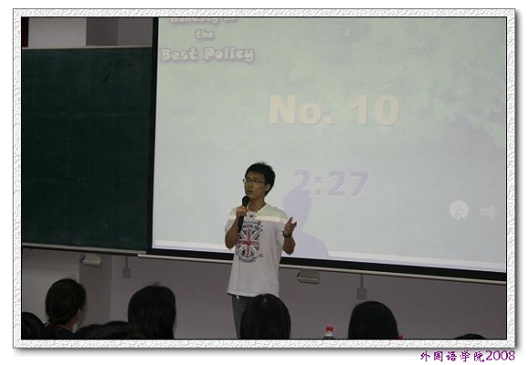 5月13号晚,在研究生公共外语教学部和外国语学院研究生会的精心组织下,开云kaiyun官网第四届研究生英语演讲比赛在研究生楼301顺利举行,在5月6号海选的基础上,本次初赛共有39名选手进入初赛。 选手们以Honesty is the best policy (诚实为上策)为演讲题目,结合自己的感悟,充满激情地阐述着自己的观点,赢得了在场同学的阵阵喝彩,充分展示了理工研究生的英语演讲水平。在评委老师的认真打分参评下,共有20名优秀选手进入决赛。决赛将在5月20日(周二)晚6:40 研究生楼301教室举行,届时将邀请北京市英语教育委员会的老师及外教评委参评,相信比赛也将更将激烈,欢迎广大同学光临!