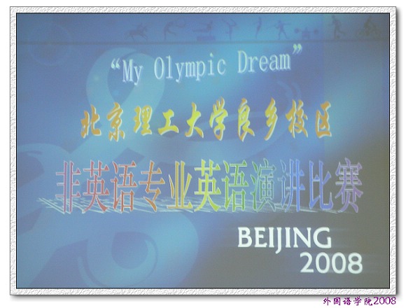本次比赛是为了营造大学英语学习氛围,加强校园文化建设,结合2008年北京奥运会的契机而举办的比赛,良乡校区2007级本科生积极参与,经过初赛阶段的角逐,每名参赛选手都表现出非凡的表现力和流畅的语言表达能力。
