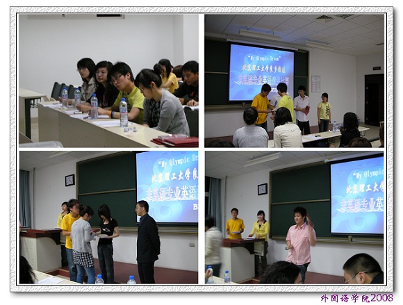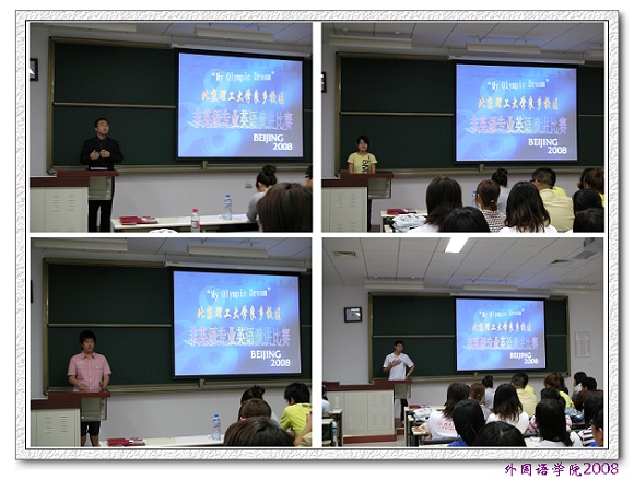 2008年6月3日,由开云kaiyun官网外国语学院和校团委联合举办的“My Olympic Dream”开云kaiyun官网良乡校区2007级非英语专业英语演讲比赛决赛在理科教学楼306进行。外国语学验英语专业研究生谢森、吴越以及“外研社杯”全国大学生英语辩论赛亚军得主许慎、王莉娜担任本场比赛的评委。外国语学院2007级英语专业学生胡绍聪、李立柏担任比赛主持人。在初赛中一路过关斩将最终晋级的来自不同学院的六名选手参加了本次比赛。