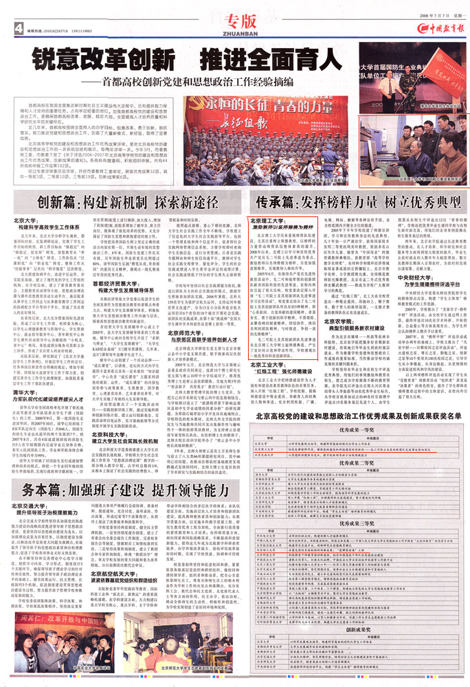 据悉,此次评审共有44所高校申报工作成果102项。经过专家评审委员会的评审,并经市委教育工委审定,获奖优秀成果有32项,其中一等奖3项,二等奖10项,三等奖19项。创新成果6项。我校获得优秀成果一等奖一项、三等奖一项,在首都高校中名列前茅。